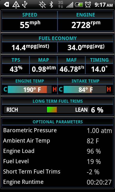 * Super fast update rate allows for optimal real-time scanning. This application allows you to read the following in your car's onboard computer: Speed -RPM -Mass Airflow -Manifold Absolute Pressure -Boost (PSI) -Advancing ignition timing Throttle-position -MPG Engine-temperature Air-temperature Long Term Fuel Trim Short Term Fuel Trim Barometric-pressure Air-temperature Motor load- -Fuel Pressure -Fuel Level (%) -Runtime engine Ratio-Equiv Sensors, oxygen (O2) -Fuel System Status * Or simply enter your own CUSTOM PID. This is great if you have a specific PID list your vehicle. You can enter your own PID and specify the accounts you would like to carry out the desired units and would like the pid to display. Record Live Data OBD-II, in real time and save it for future viewing. Export scanned data stored in Excel -Live Scan imperical fuel economy or metric. -Establish fuel consumption calculations to use MAF or MAP mode. -Read PSI / Boost (for cars turbo / supercharged). -Customize the design of the OBD parameters on the screen. -Show imperical or metric readings. ELM327 adapter-Advanced Reset / Information Reading. -Show the current trouble codes. -Save current trouble codes. -Send the current trouble codes. -Turn off (Reset) Check Engine Light.